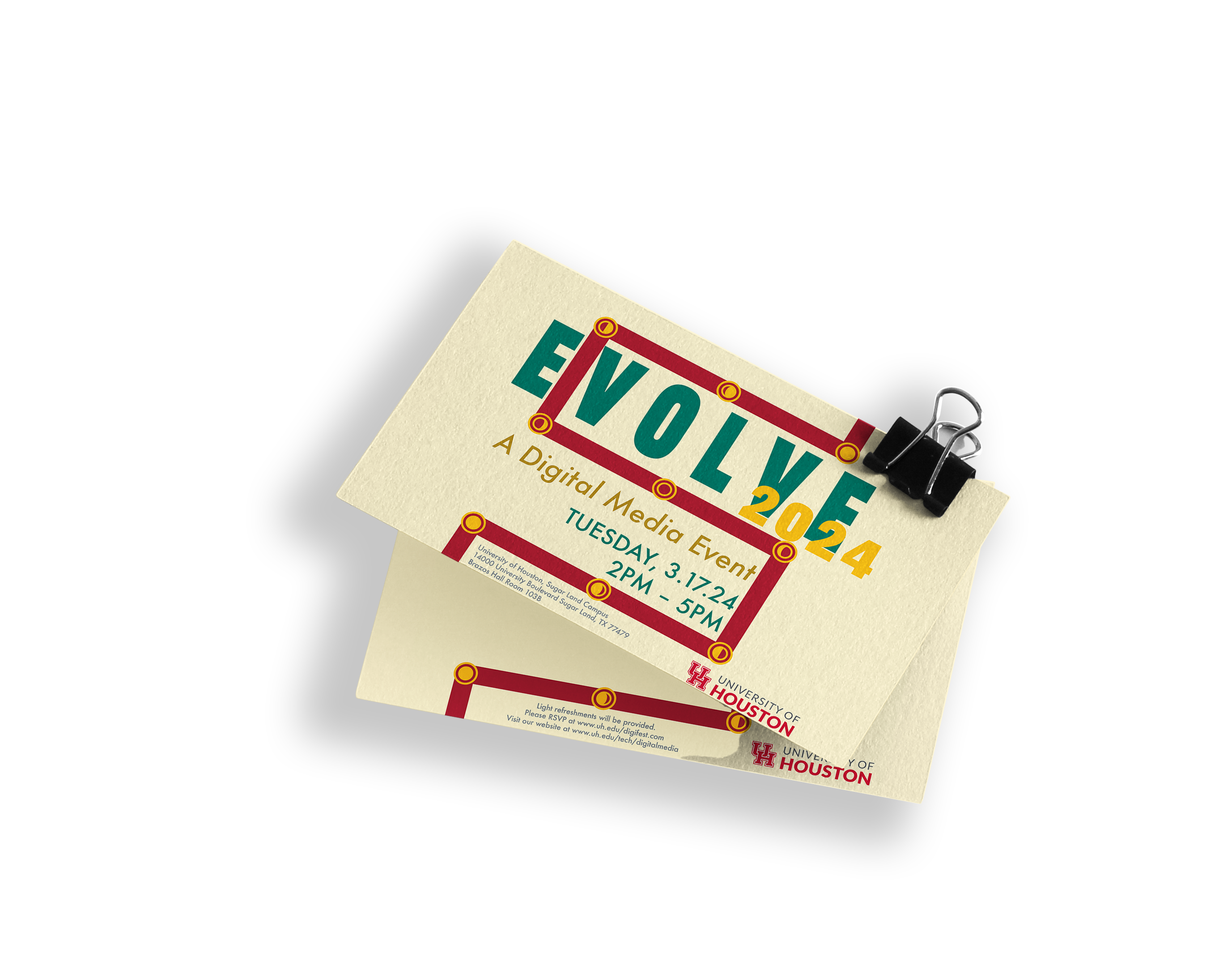 For my event design project, I created a cohesive visual identity for Evolve, an exhibition where digital media students present their best work to professionals in the industry. The goal of the project was to design a suite of materials that not only represented the creativity of the students but also conveyed a professional, polished image to the workforce audience. Using Adobe Illustrator and InDesign, I developed a consistent design system that tied together every piece of collateral.
